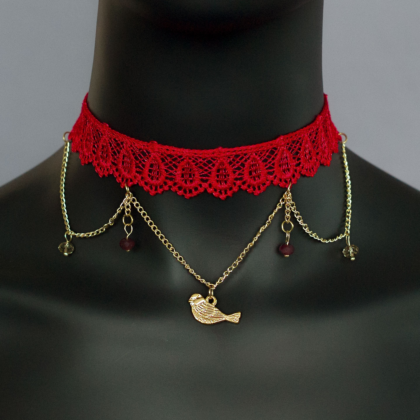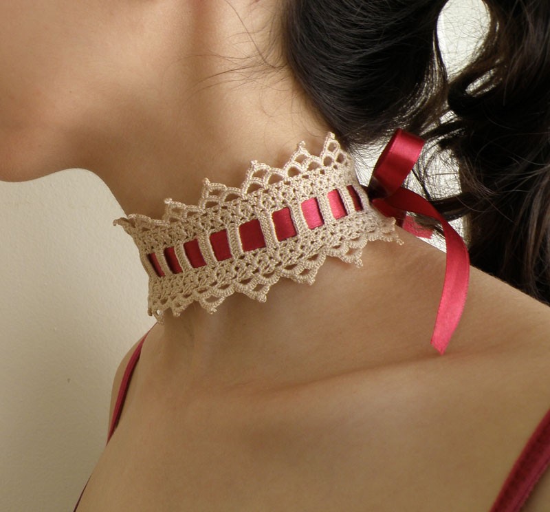 Red color for the choker, at first glance, it seems atypical. However, it was he who became popular since the days of the French Revolution, when women with a thin red stripe around their neck condoled the victims of the guillotines. Later, a simple strip was replaced with openwork ribbons with all kinds of decor.