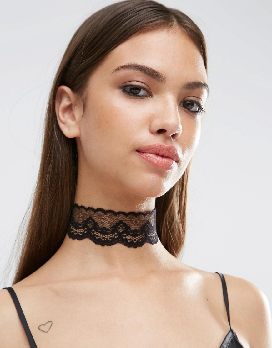 The most popular model is a thin black lace strip. Such a choker gives the image sophistication and mystery. It fits a lot of outfits.Narrow black lace is important for day walks as well as for evening wear.