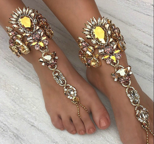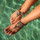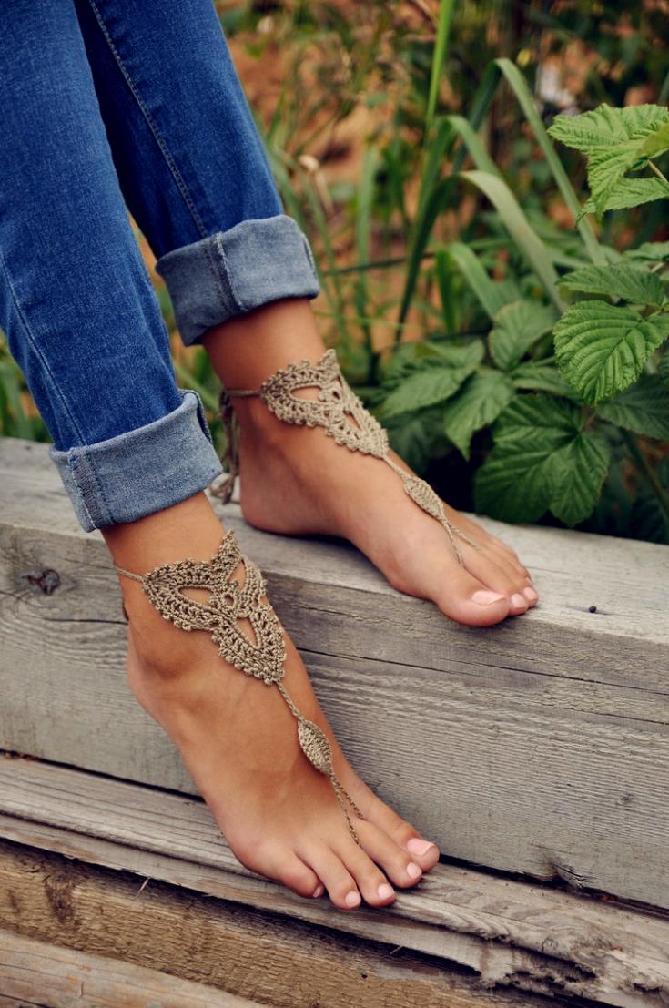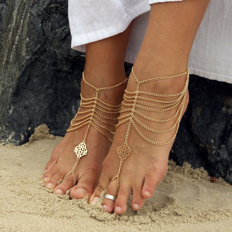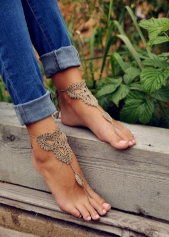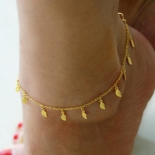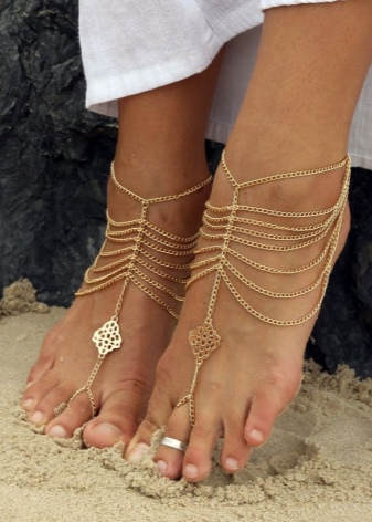 Chains of gold can rightly be considered the most popular among the anklets. They perfectly emphasize the femininity and sexuality of their mistress. Many girls choose such bracelets, because they shimmer beautifully and shine in the sun, especially if additionally trimmed with precious stones. The gold chain usually wraps around the stem once or twice, and you can decorate it yourself with symbolic pendants. Designers do not recommend the use of such an anklet in everyday wear - wear it on social evenings and dates.