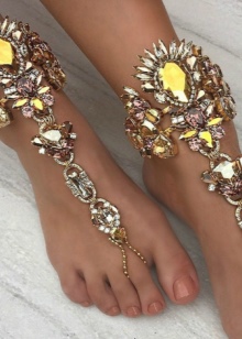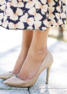 If you are preparing for a secular party, anklets will be the perfect end to the image. They are well combined with both long and short evening dresses. As for the material, it should be metal. White gold with precious stones will look great. Shoes should choose either classic pumps, or very high heels.