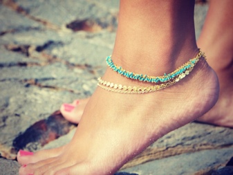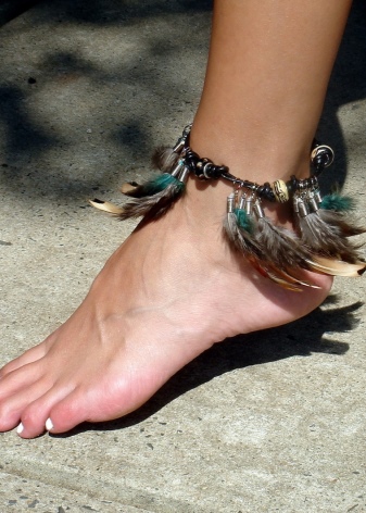 Not only precious metal anklets won popularity among girls. Interesting jewelry is also worth it to pay attention to it. The original handmade chains of glass beads, leather and feathers are perfectly combined with both urban style and ethno and boho. Bracelets with turquoise and amber inserts look beautiful. Active ladies can look at the chains of beads - these colorful little things are the best fit to the colorful range of summer and late spring.
