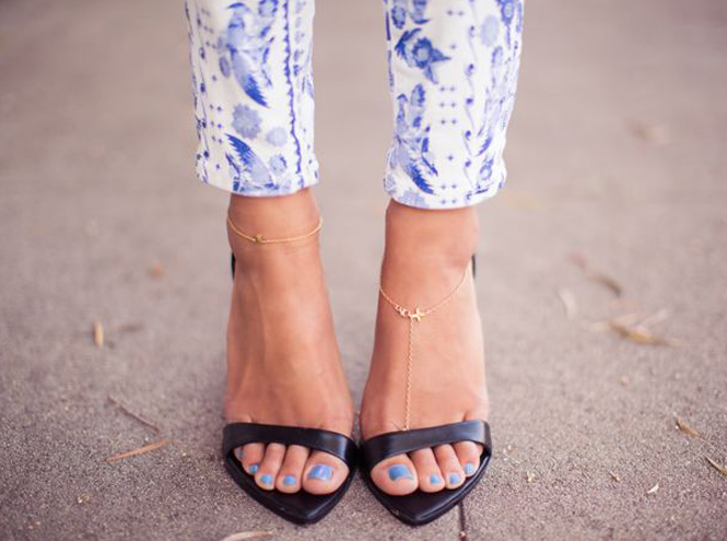 Choosing a chain to the ankle, it is necessary first of all to focus on your own style of clothing. In a business manner, only anklets from expensive metals are relevant. Yellow and white gold will do. If the dress code is not strict, feel free to wear a white gold bracelet, adorned with small elements or precious stones. Anklets look especially beautiful in combination with a strict blouse, tight pants or a skirt and high-heeled shoes.