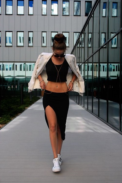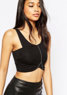 If you are a happy owner of a taut tummy, then you will look great on high shorts and a cropped top. A metal belt or a thin chain framing the stomach and stretching to the neck will harmoniously fit into this ensemble.