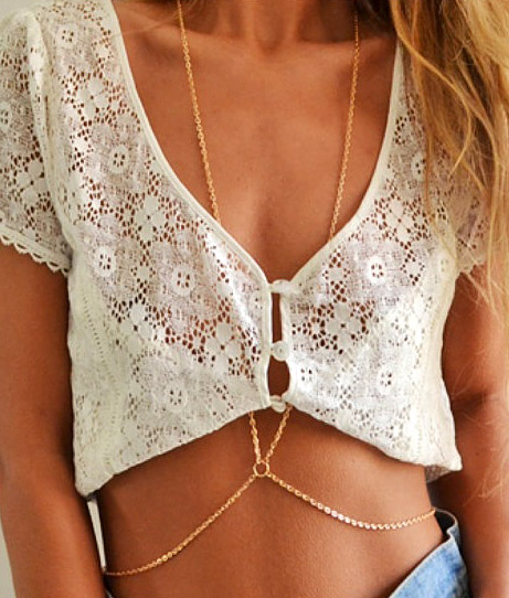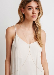 Body chains are an excellent choice for many summer dresses. It is possible to refer to them any bathing suits. It can be both sexy bikini and fused models. But it is necessary to take into account the fact that the decoration should be free to sit on the body, without cutting into the skin and not creating ugly folds.