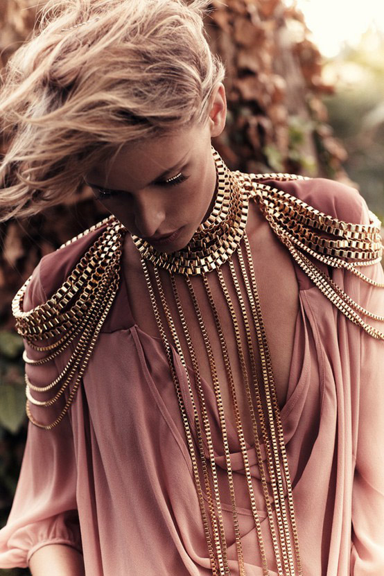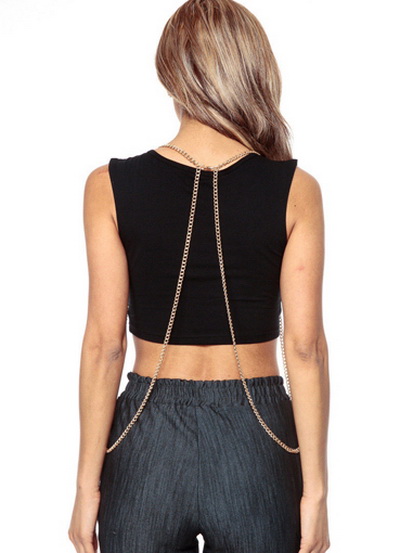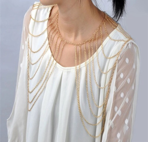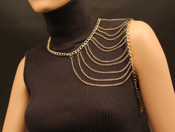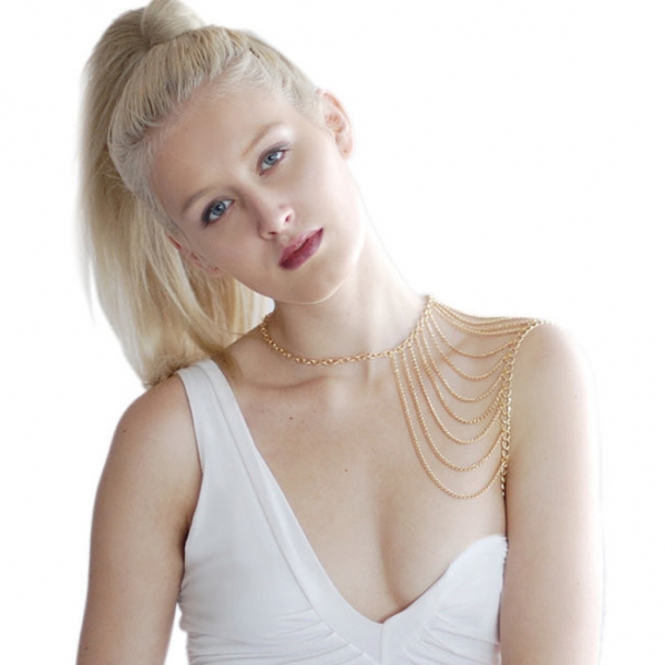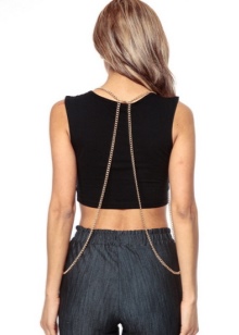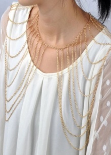 - No less popular today is a fashionable metal chain that you need to wear on your shoulders. It can be neat and thin, assembled from miniature links, or unusual, created in the form of several small chains scattered over the shoulders.