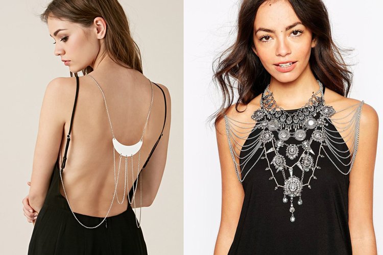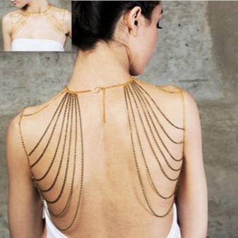Perfectly woven chain will look with evening ensembles. The tandem of a dress with an open back and metallic bordicane, falling from shoulders to back, looks especially bright and feminine. Such a seductive set will surely attract the attention of the opposite sex!