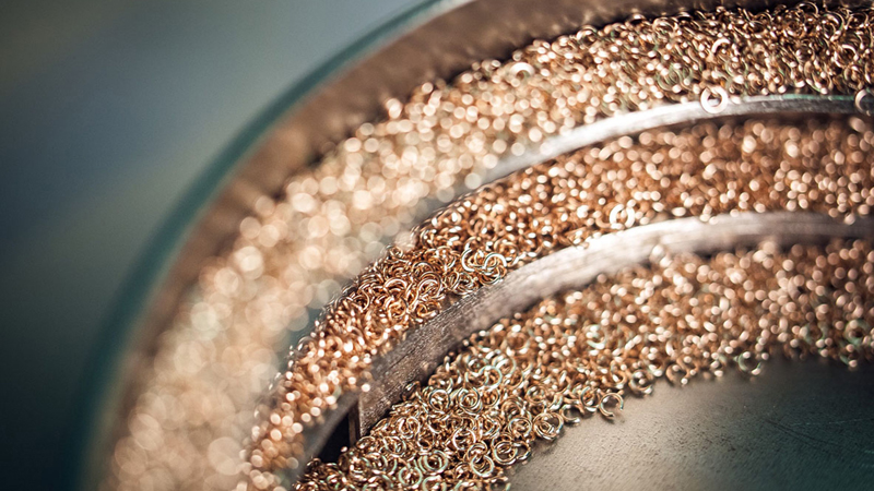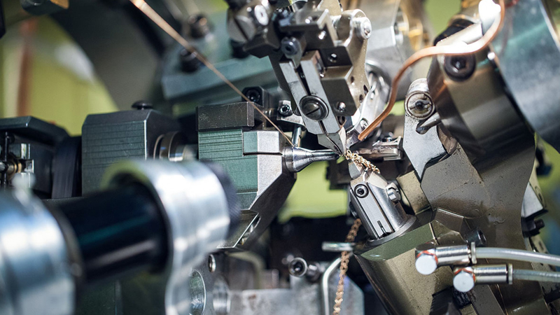 With the help of the machine produced a large number of links. The jeweler with a magnifying glass checks each for the absence of various kinds of damage, then removes the finished parts from the machine. They are placed under the press, where the faces of neighboring links are connected.