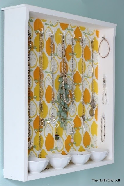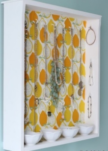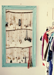 The frame with stretched ropes is another original, but simple idea to implement. Fine, if in the bins will find a frame of a fancy shape. But if there is no such one, then you can paint the usual base with bright colors or in tune to the interior. Then connect the sides with all kinds of ribbons or strings, on which it is very convenient to hang your “wealth”.