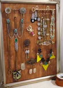 As an organizer for jewelry, a simple wooden hanger will completely come off. In it, even the most fragile girl will be able to drive carnations and twist hooks. Then the hanger with jewelry can be easily hung anywhere in the room.