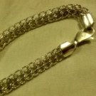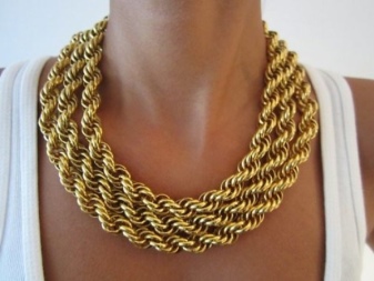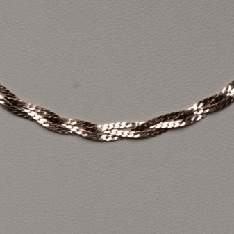 It is an interlacing of several tapes of an armored type of knitting. The jewelry is voluminous, impressive in its brilliance and acts as an independent piece of necklace type, not requiring additions in the form of any pendants. Ribbons of such jewelry can be made of gold of different colors.