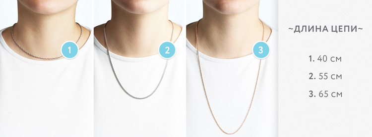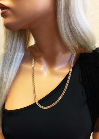When choosing, one should pay attention not only to the type of weaving and the type of lock, but also to the length of the decoration. A universal option for women is the length of the chain of 40-50 cm. The length of 50-60 cm is selected if you want to visually lengthen the neck.