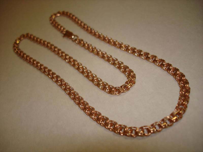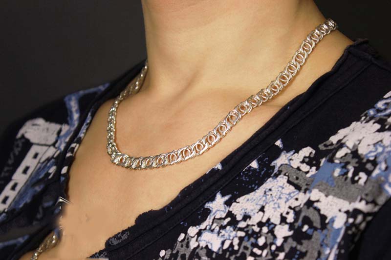 Elements in the form of a ball and cylinder are connected with the help of a thread. A chain can consist only of “ball” elements or of two types of elements; it can have several rows, that is, be double or triple. The method of making such a decoration is hardly difficult to weave. The jewelry is more like beads than a chain. It looks very impressive, but it requires a very careful attitude, because it is easily deformed, for the same reason it does not wear with suspensions.