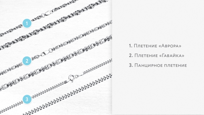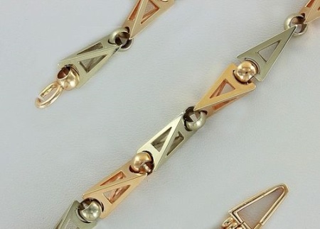 There are also unusual combined weaving, when different types of mating are combined in one ornament, for example, “fox tail” and anchor. Elements of different types can be made of different gold alloys.