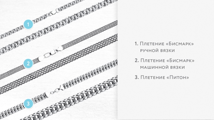 Links of chains can be connected with various decorative inserts, for example, jewelry of the Bismarck type can be decorated with precious stones. Links are non-standard forms and unusual design, for example, in the shape of the letter “A” (weaving “admiral”) or in the form of a figure eight, the variety of options is very large.