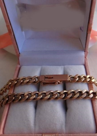 At one end of the chain is fixed decorative part of the lock in the form of a box. On the opposite side of the product there is a hook that is inserted into the box and secured with the notches on it.