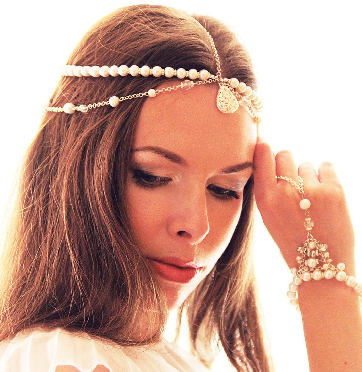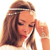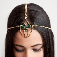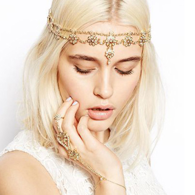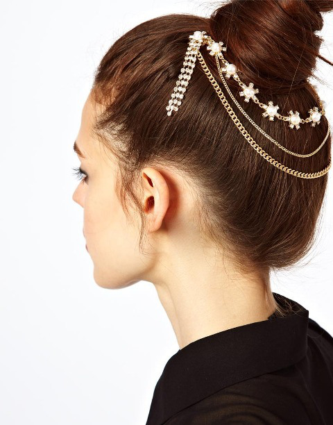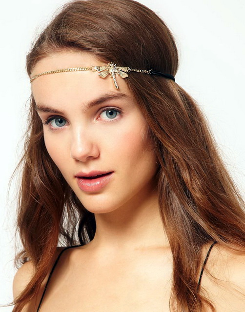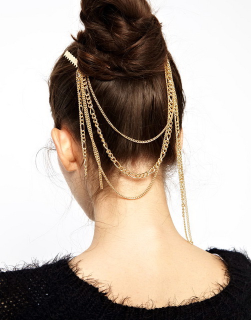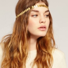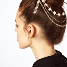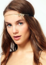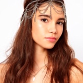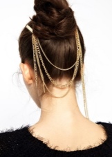 One of the trends of the new season - a chain to the head. There are various options for wearing such jewelry and they all have Indian roots. The chain can be one and decorate the parting. There may be several of them, they may be located in parallel or intertwined with each other. Often the chains are additionally decorated with small pendant stones. This decoration looks very unusual and is most often used to create an evening or ceremonial hairstyle.