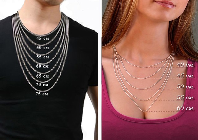 To determine the appropriate size, it is necessary to wrap the neck with a thick thread in such a way as one would like the chain to hang. Then round the resulting value to the nearest multiple of five. This will be the right size.
