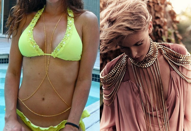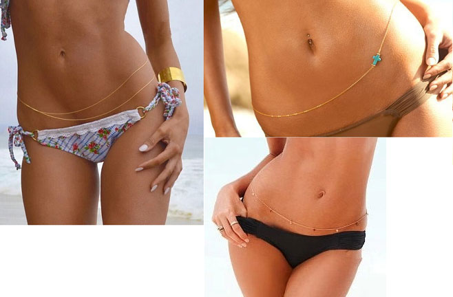 Body chains look perfect in the hot season. They can be worn with summer clothes, bathing suits, they can decorate naked parts of the body.
