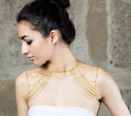 Another interesting option - a chain on the shoulders. Especially if such a decoration is made of several tiny chains scattered over the shoulders, like a brilliant spiderweb. Looks incredibly impressive and stylish.