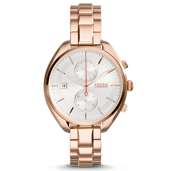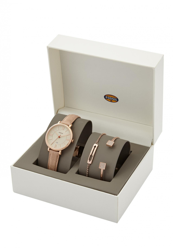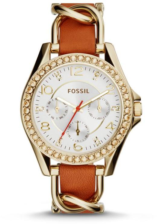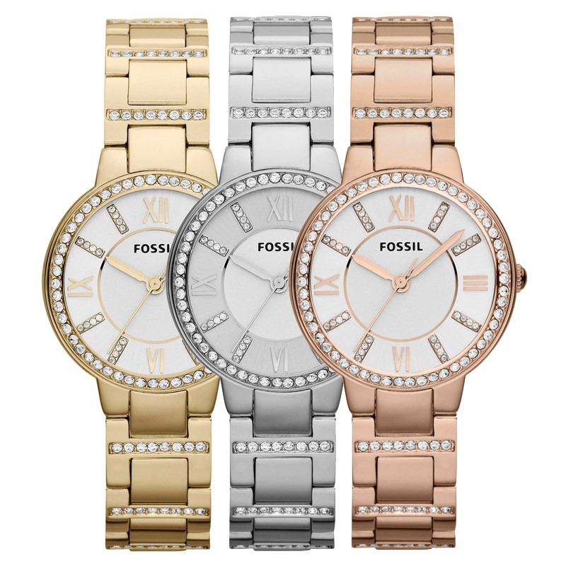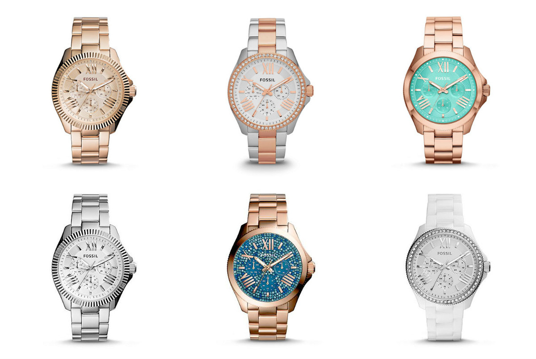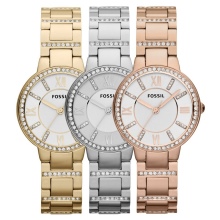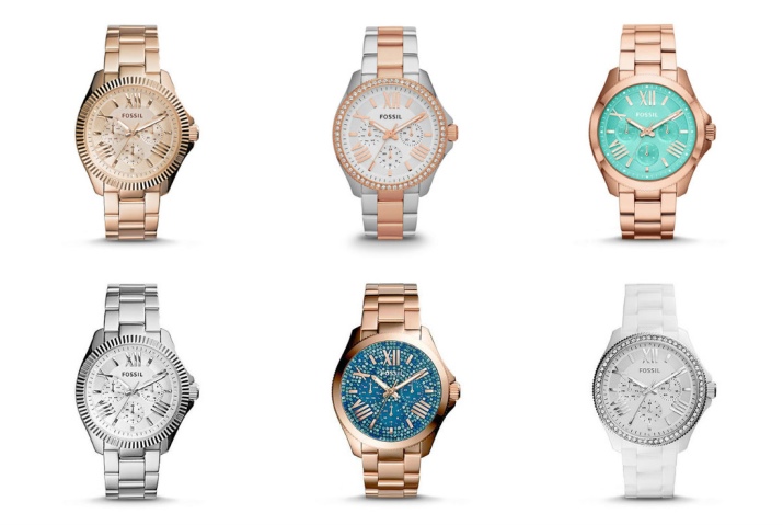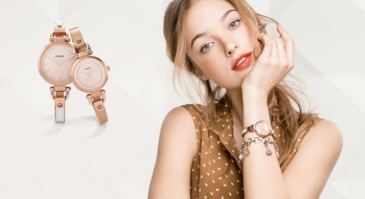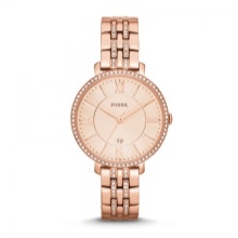 Wrist watches with a bracelet, produced by the brand Fossil are divided into collections. The most numerous Jacqueline. A graceful watch with a thin bracelet, a quartz type of mechanism, the color of the dial can be white, golden, less often pearl with the WR 30 water resistance index. The case diameter is from 26 to 36 mm.