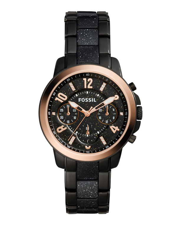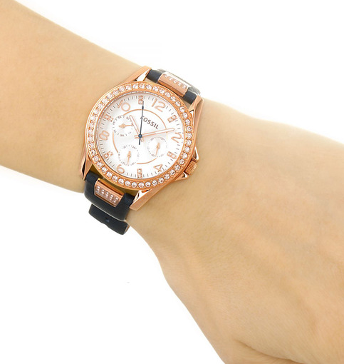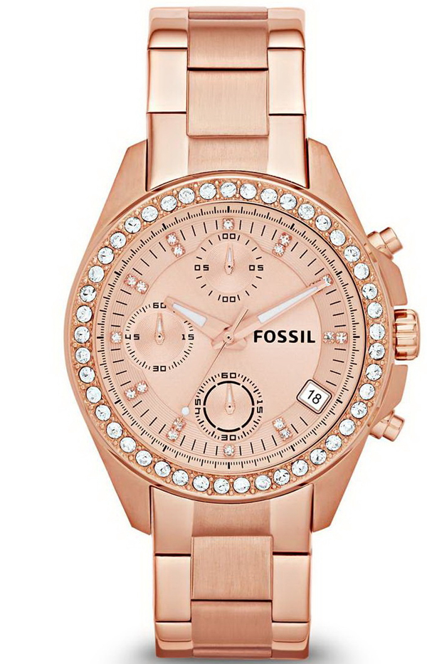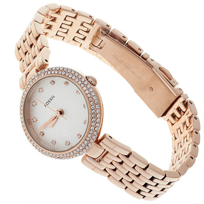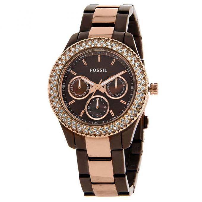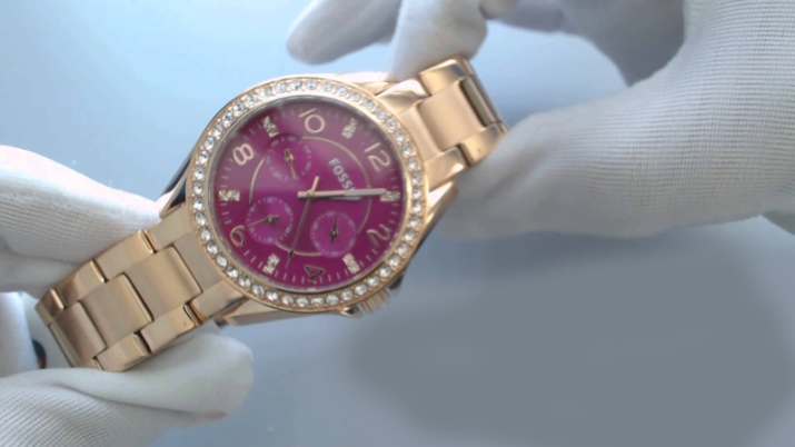 Not only the case is exposed to decoration, but also the dial itself, with the help of jewelry enamel. It not only gives the dial the desired color, but also protects it from corrosion, the negative effects of acids, alkalis and gases. The color palette obtained by using enamel is very extensive. Black, white, brown, blue, beige, as well as silver, pearl, champagne, golden - all these colors and shades look great on the dial and advantageously emphasize the style and belonging of the watch to the Fossil brand.