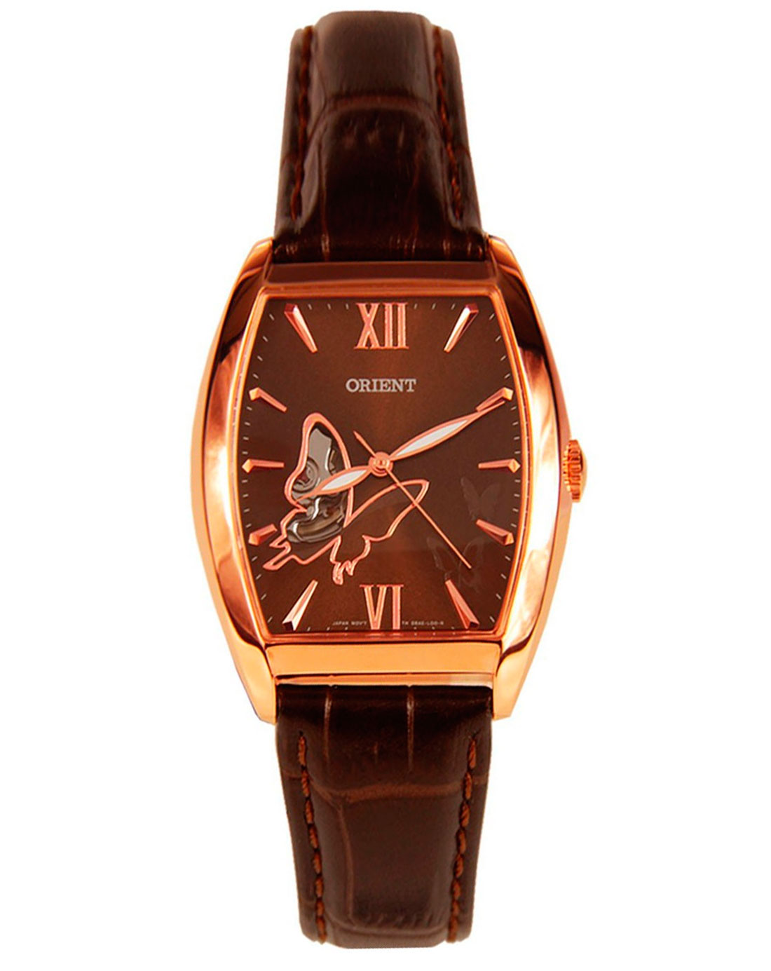 - DBAE001T. Classic rectangular shape on a leather belt. It features a memorable decor: an open watch mechanism and images of butterflies. The product has a fairly versatile design and is suitable for most clothes from the wardrobe.