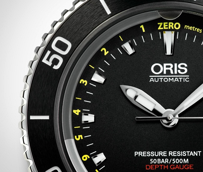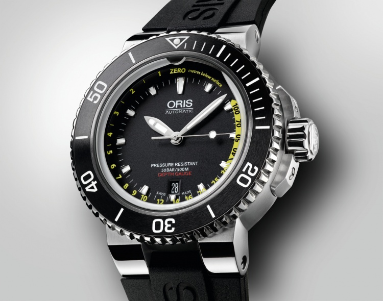 Watch Oris Aquis Depth Gauge, designed specifically for diving enthusiasts. A depth gauge is built into their mechanism, water enters it through a special channel made in sapphire glass. The body is made of steel, which makes it extremely resistant to various damages.