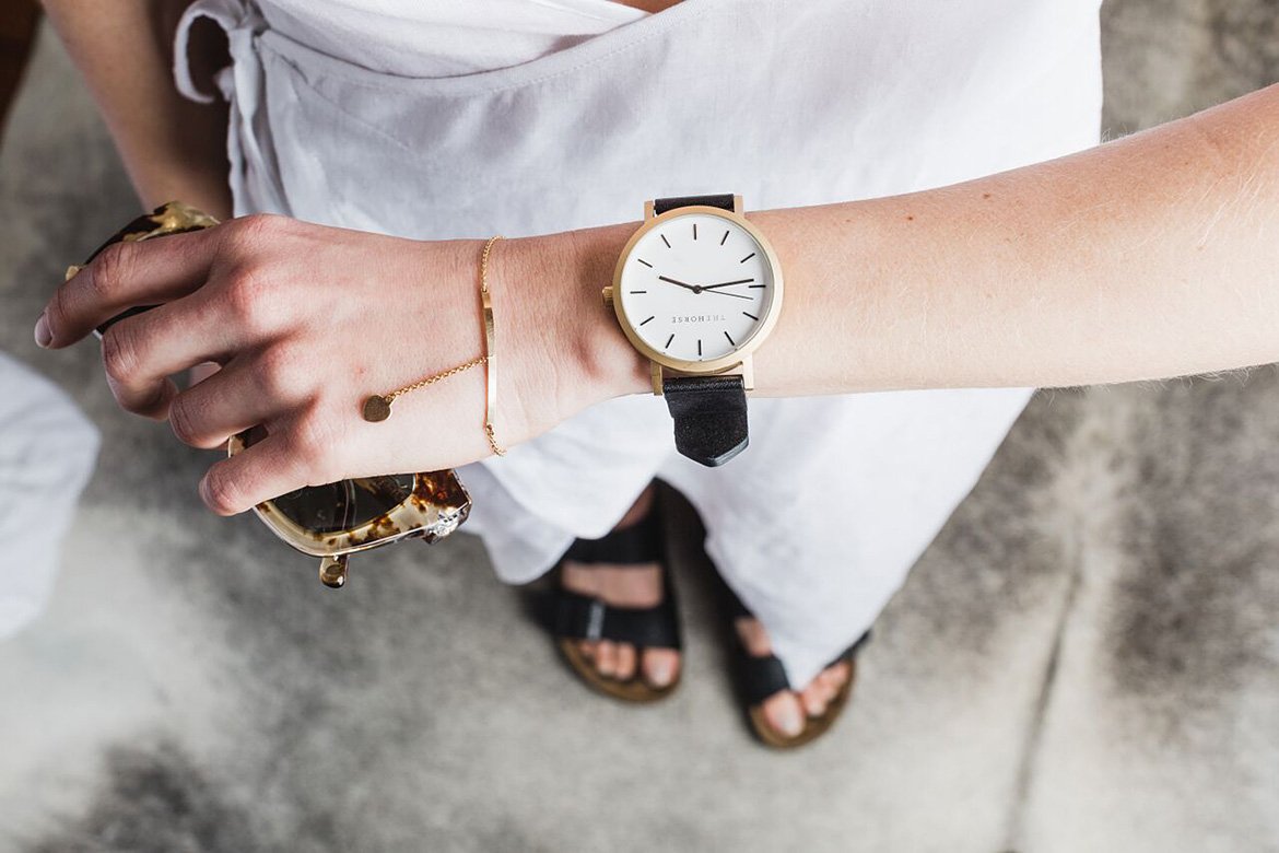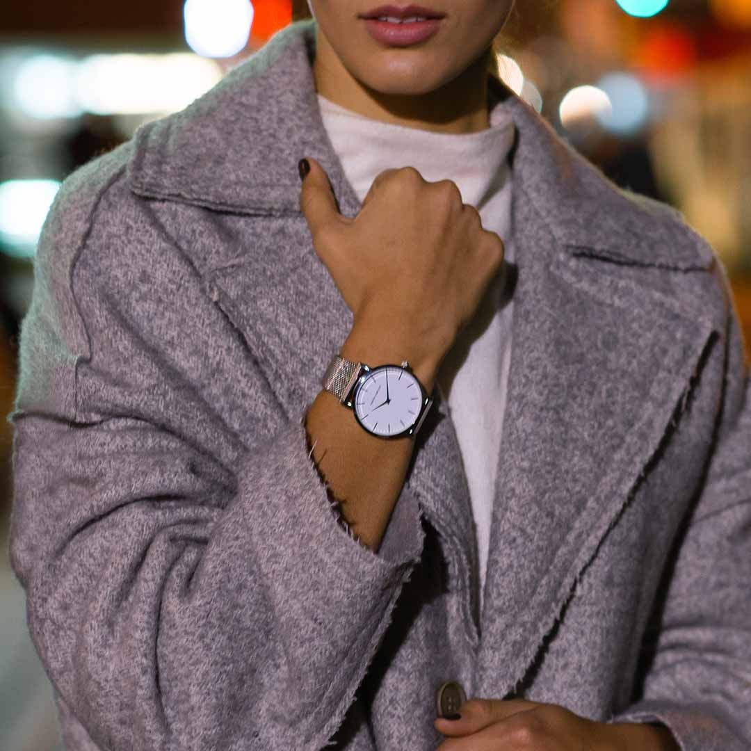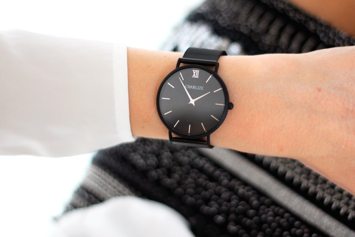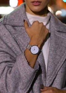 - Design. Monochrome clocks, made in soothing colors, will be combined with almost any outfit. Black, gray watches are suitable for everyday wear, and for solemn images.Another option is when the watch is selected for specific clothes, combining shades, decorative elements or, conversely, building an image based on contrasts.