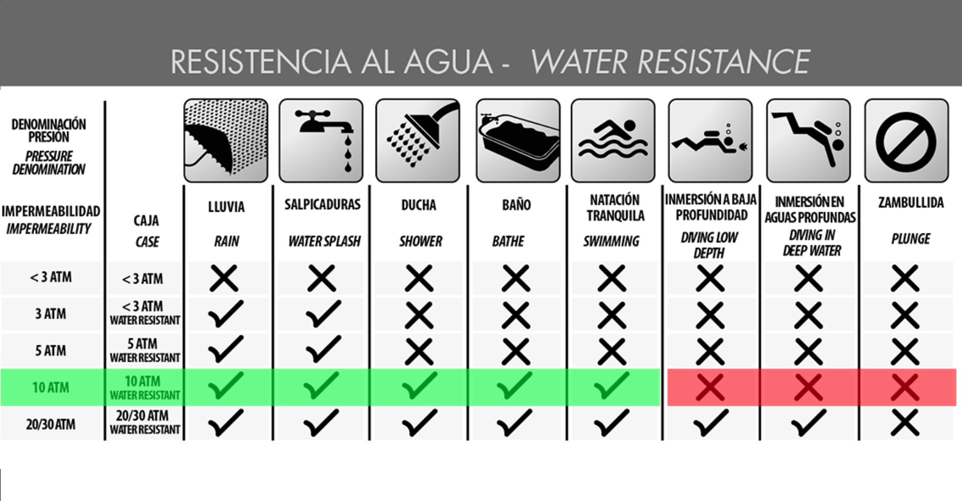 - 100 m (10 ATM). Designed for water sports: surfing, diving with a mask. A sudden drop in pressure at a great depth may cause the watch to break.