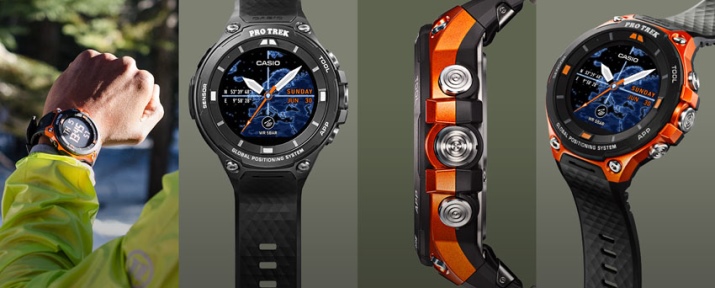 Professional watches are more expensive due to improved performance. Suitable for extreme tourism Casio Pro Trek WSD-F20 with built-in GPS and Wi-Fi. The model allows you to download an interactive map, find out the weather, it is equipped with altitude and pressure sensors, and a pedometer. The display has a high detail, based on the design taken contrasting shades.