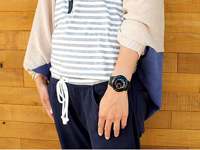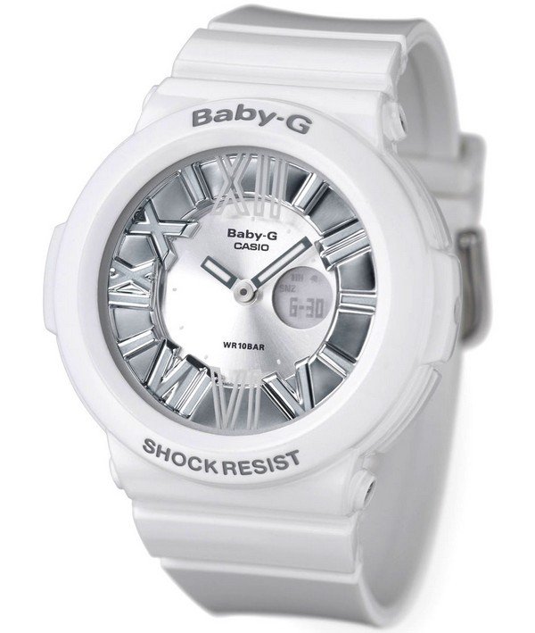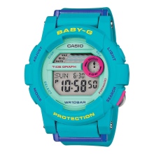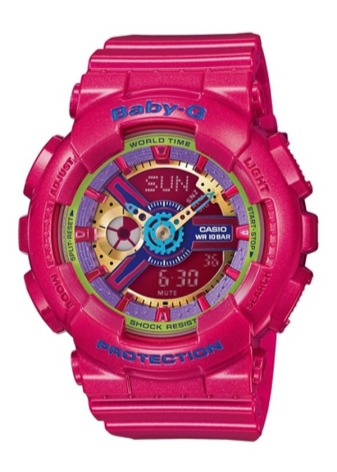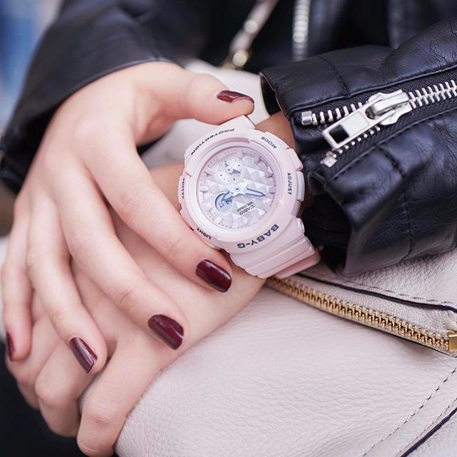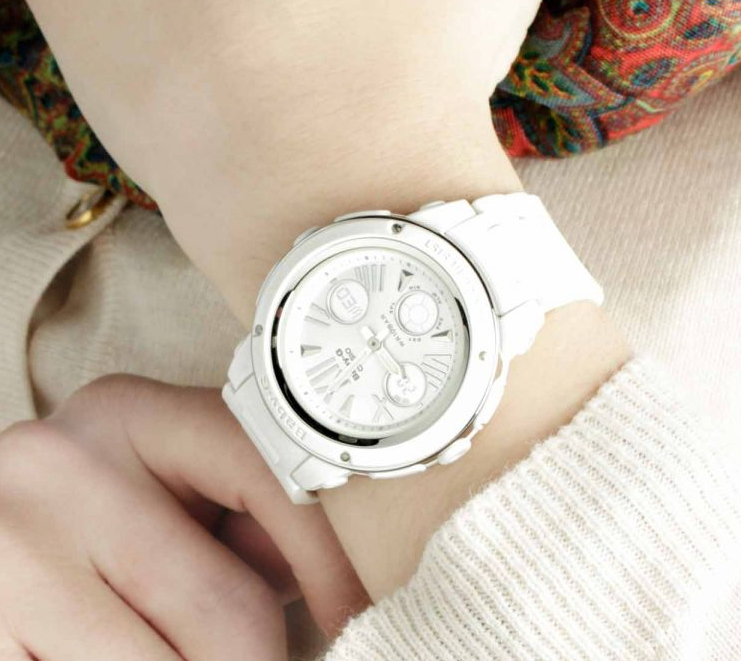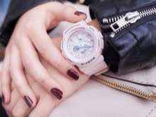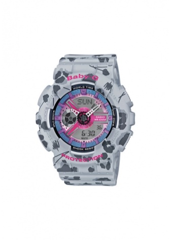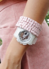 - Another popular female model is the Baby-G watch. Their design is made in a sporty style. This comfortable and bright watch has shock-resistant characteristics. They are ideal for energetic girls who lead an active lifestyle. Such useful devices are equipped with high-precision stopwatches. Baby-G watches are distinguished by their rich colors. On women of fashion look bright pink, white or salad-colored models. Such color solutions are provided so that the fashionable gadget harmoniously looks in the ensemble with a bright sports suit.