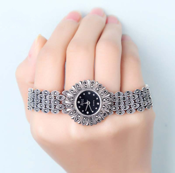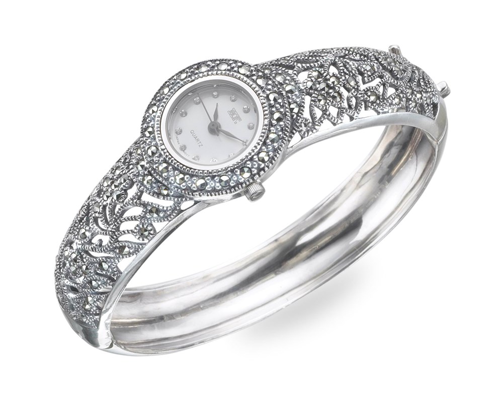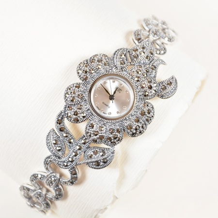 - Beautiful and harmonious appearance possess accessories with marcasite. These stones can be yellow, light green, black or gray. These colors look very elegant in tandem with silver. The natural charm of fashionable women is able to emphasize shining watch with openwork bracelets, complemented with a scattering of marcasites.