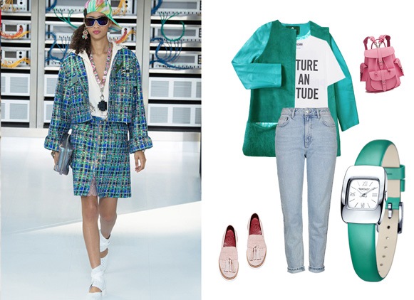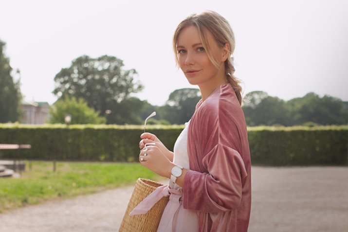 - Pick up a light, light top, a soft pink skirt and put on pastel-colored jackets with long sleeves. A silver watch with a light dial and a woven bag will look perfect in this romantic ensemble.