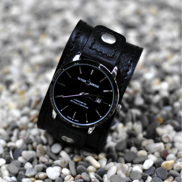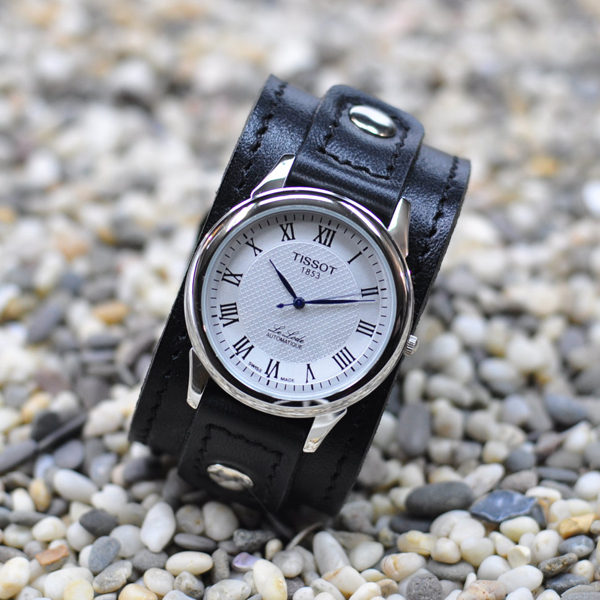 Leather wide bracelets are a regular strip of material that houses a silver case.