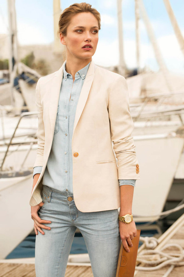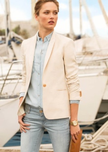 The latest trend is a gold watch, the strap of which repeats the color of the suit - especially if it is sandy, scarlet, pale pink, light blue, khaki or red. In order not to overdo it with color, dilute the suit with a black or white blouse, T-shirt or T-shirt and give preference to skin-colored shoes.