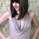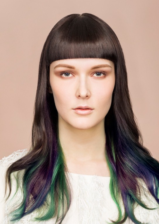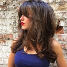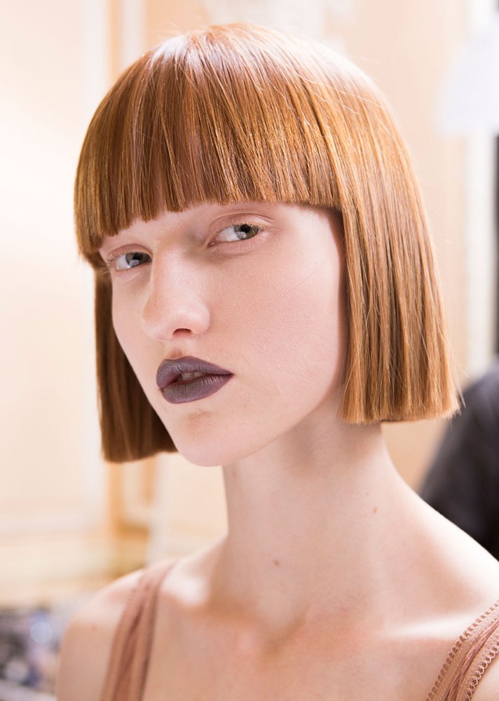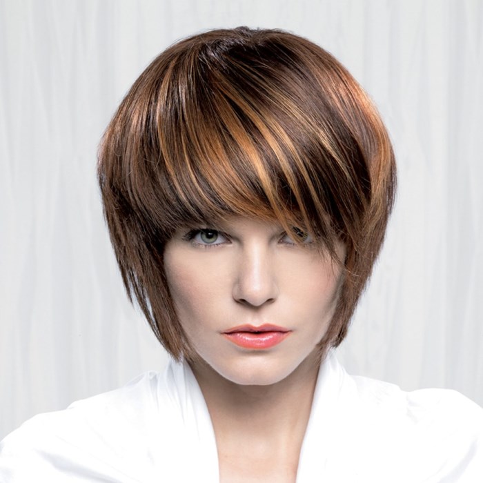 - Hair is cut at a slight angle to give bangs a little volume.