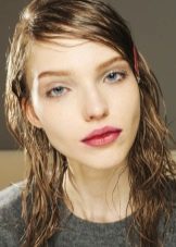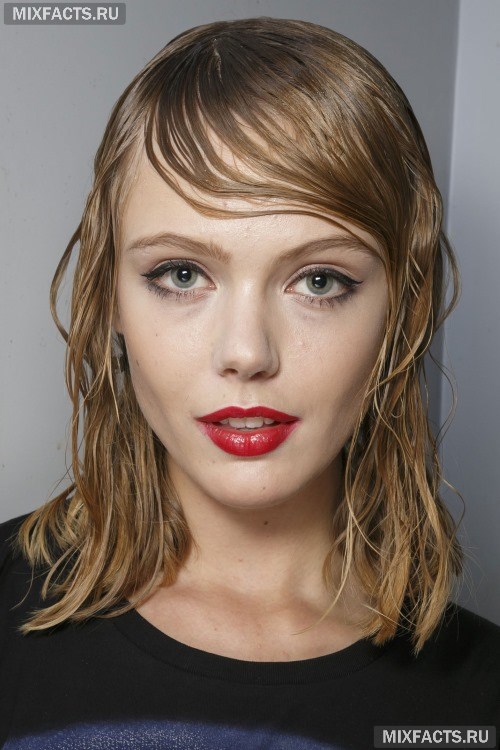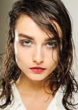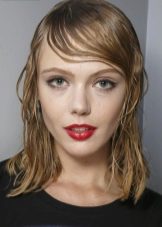 - Bangs on the side with the effect of wet hair - another original and attractive solution.