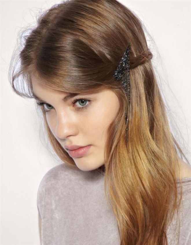 - Then you can turn to a variety of experiments.For example, from a long bangs to organize a beautiful semicircle, apply bright colored hairpins, weave a delicate braid, or just disguise the strands, hiding under the others.