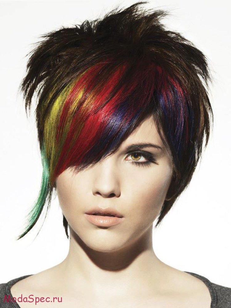 For example, young and courageous girls who love bright and non-standard solutions often paint the side bangs in blue, purple, burgundy, white or black.