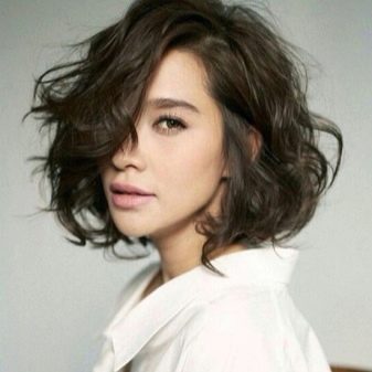 - On the side. Strands fit on one side. This option is suitable for almost any face shape. Hairstyle is easy to style. The curls laid to one side can be pulled out with an “ironing” by fixing with hairspray or gel. You can also lay them in a soft wave with a curling iron. Another option is to dry the wet hair with a hairdryer, immediately pulling the curls to the side.