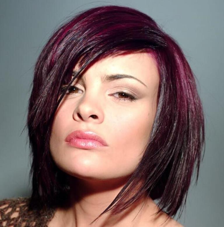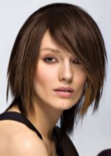 Combined with haircuts cascade or square. Those who wish to make one of these haircuts with a torn beveled bang need to understand that it will look beautiful only on owners of people with high foreheads. Cascade strands perfectly mask defects, rejuvenate and soften facial features, especially highlighting the eyes and eyebrows. In addition, with oblique bangs looks amazing asymmetrically decorated car.