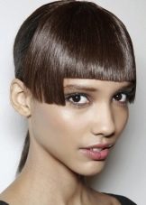 A short bang of a torn configuration can be beautifully combined with haircuts made in even lines. She adds a certain "highlight" in a perfect smoothed image. And also the advantage of such a bang will be with trendy squares and a bean (like Halle Berry and Alyssa Milano).