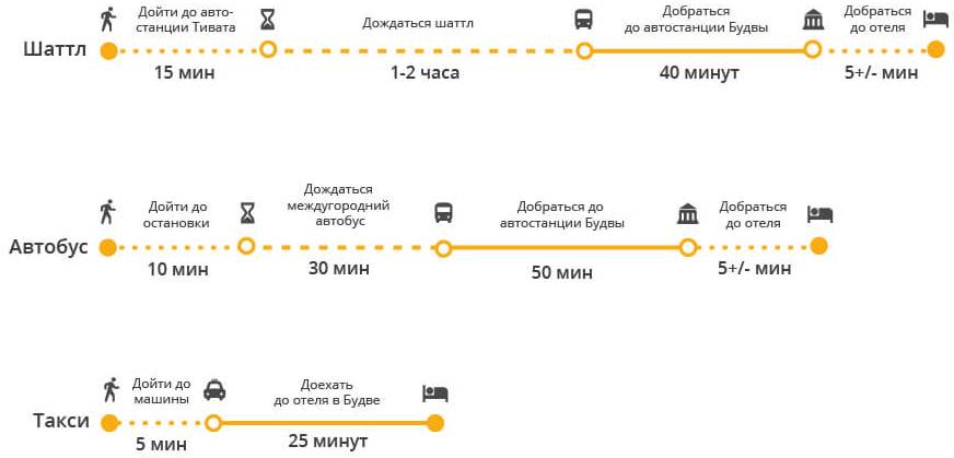 For the traveler, it is important to correctly calculate not only the distance, but also the time that can be spent on its overcoming. The bus that makes intermediate stops on the route, from Tivat to Budva, will take a good 40 minutes, and a taxi, of course, takes 20-25 minutes with the breeze, but the first option will certainly be cheaper for the tourist.
