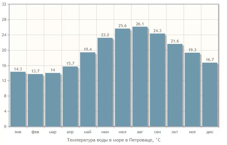 November is considered the rainiest month of the year - up to 220 mm of precipitation falls at this time, slightly less rainy days fall in February and March, since in these months precipitation falls to 190 mm and 180 mm. The driest month in Petrovac is August, when, as rain, the ground drops to 15 mm of moisture. In September, the probability of rain increases sharply - more than 80 mm falls in this month.