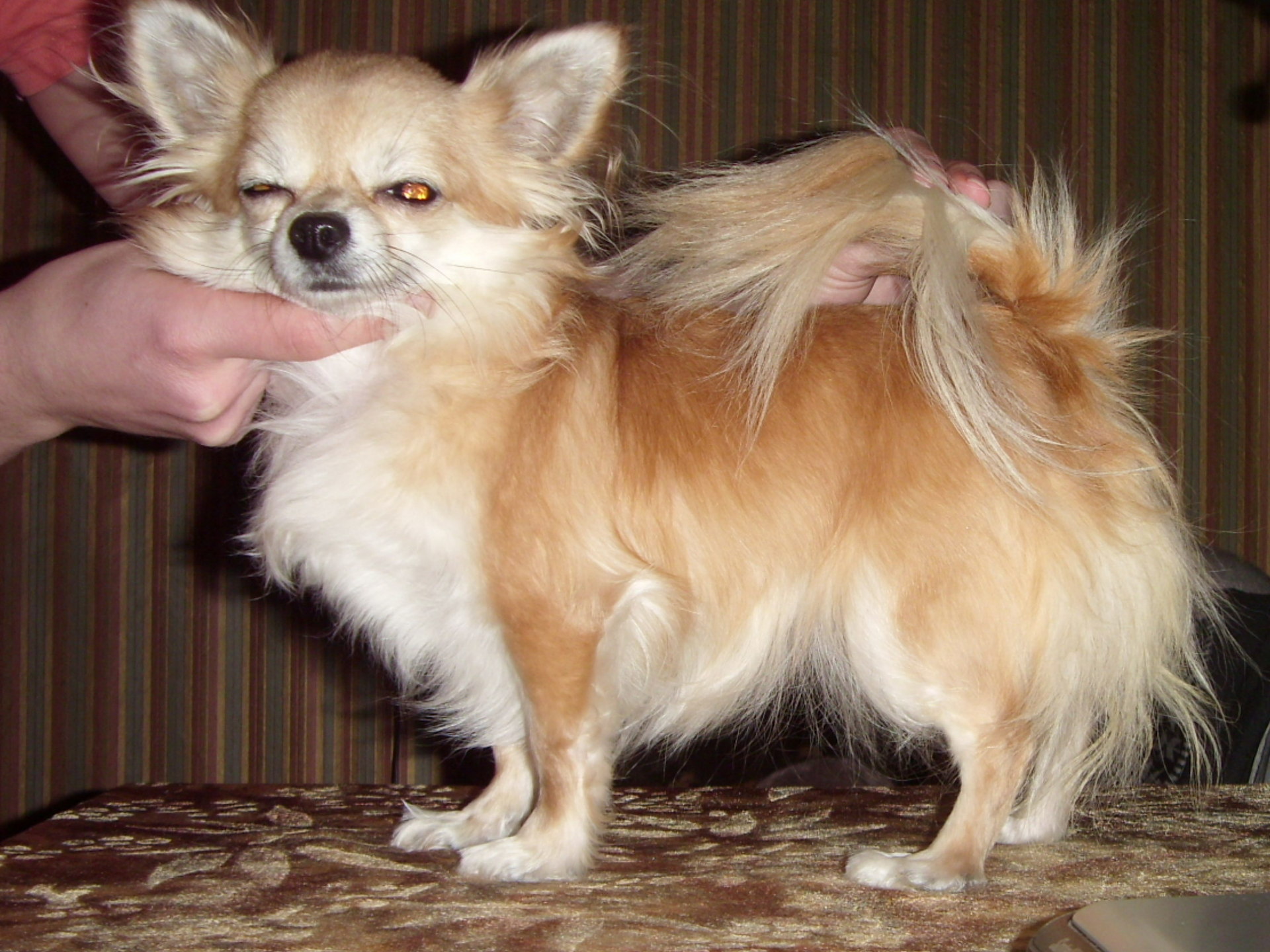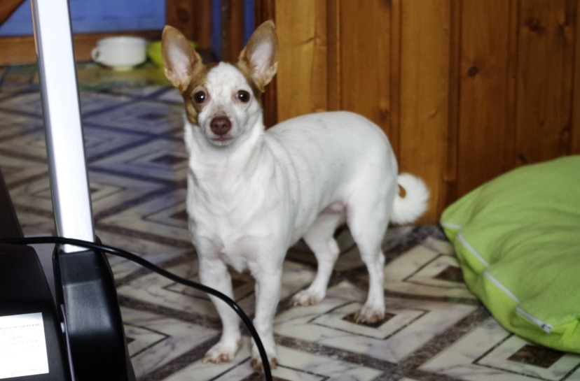 A mixture of these breeds is extremely rare, since it is not very popular. Externally, dogs are larger than Chihuahua, have huge ears, surprisingly graceful legs, a small tail. The coat is short, red or black in color, sometimes with scorching marks; molting is practically absent.
