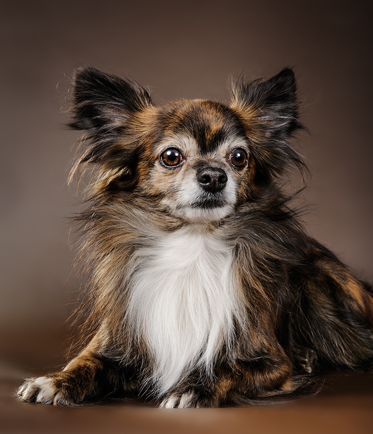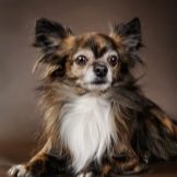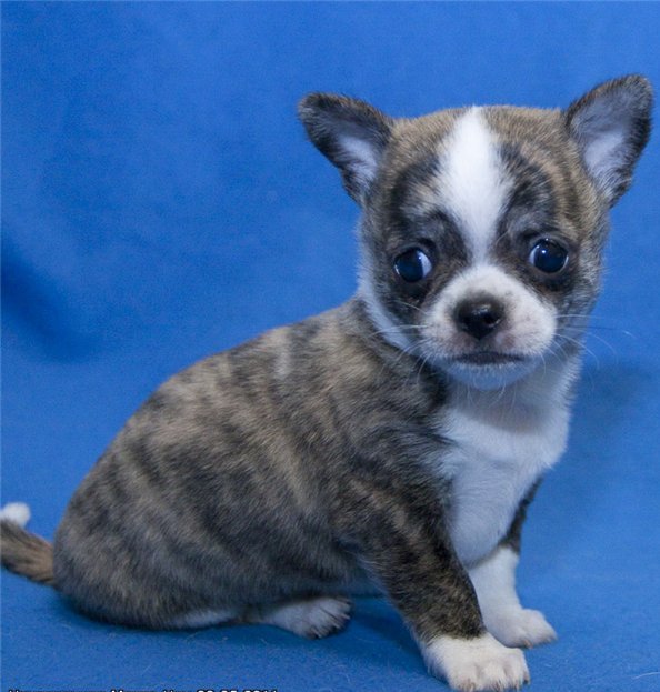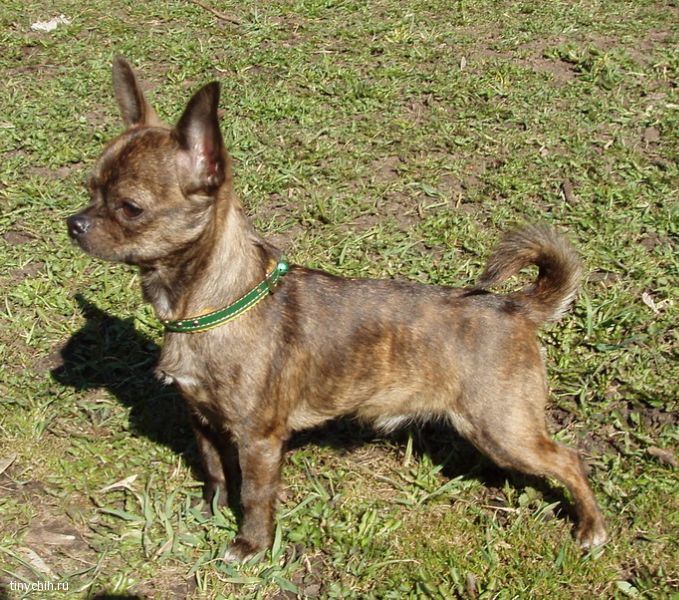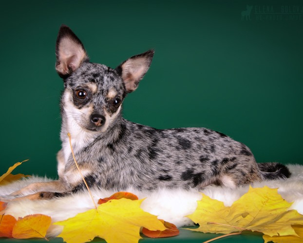 One of the rarest and most sought after colors for many Chihuahua breed fans. Tiger color is a striking pattern of different spots and stripes, which contrast with the basic tone of the coat, which ultimately resembles a bright tiger skin. Such dogs look very impressive.