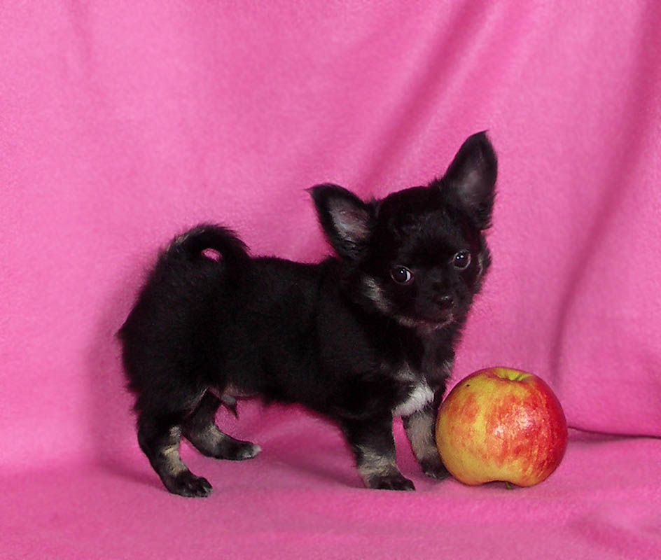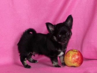 Quite difficult today to meet the 100% black color in the Chihuahua breed. Color inserts appear on the breast, often visible on the pet's head, its paws and tail. The black color with a reddish tan, as well as tan points of a reddish or light tone, looks very spectacular. This kind of color is often called differently, but it is recognized by experts as a black and tan color. On the torso of the dog (on the breast most often) there are also milk spots. But the snow-white golfiki of the same color can also be, but much less. Such a shade is absolutely not like the culled Merle.