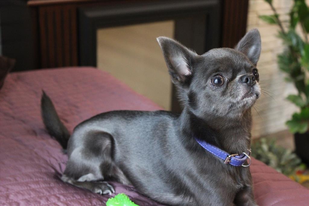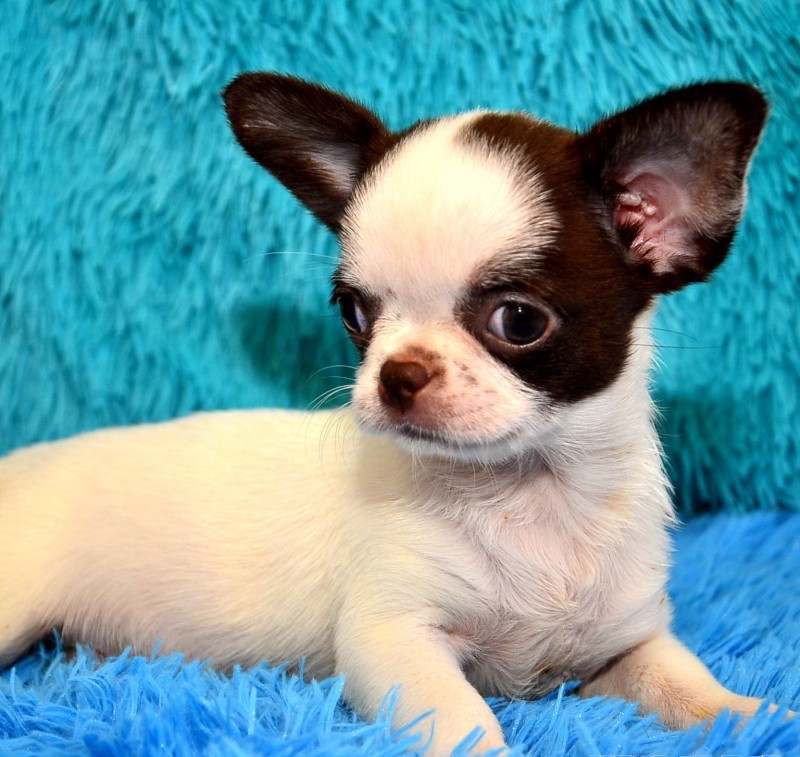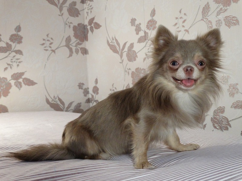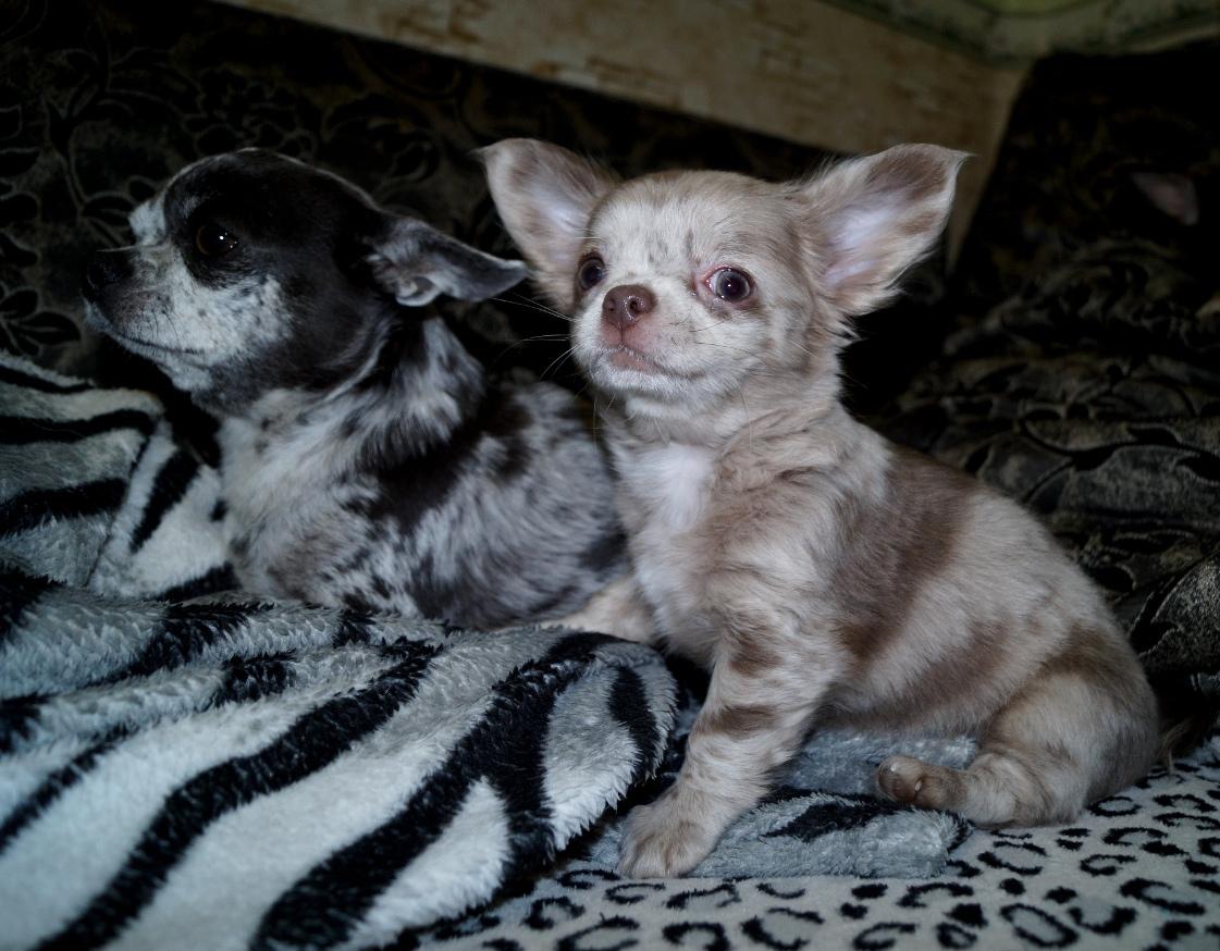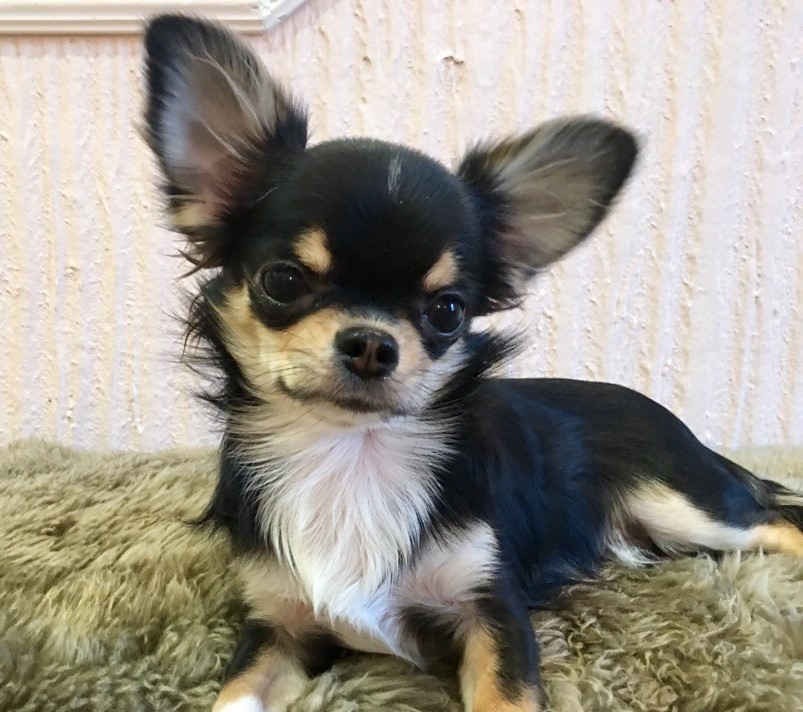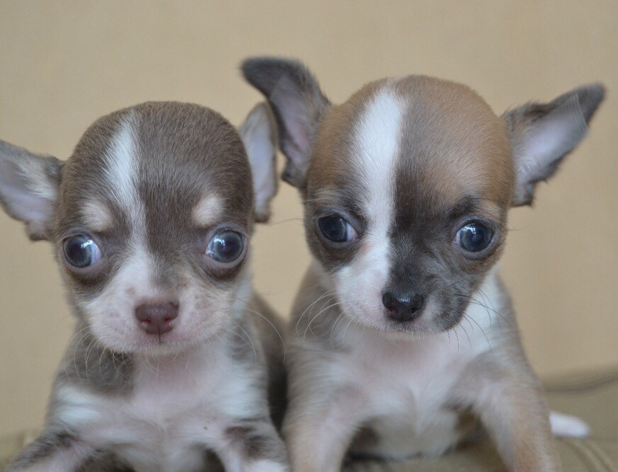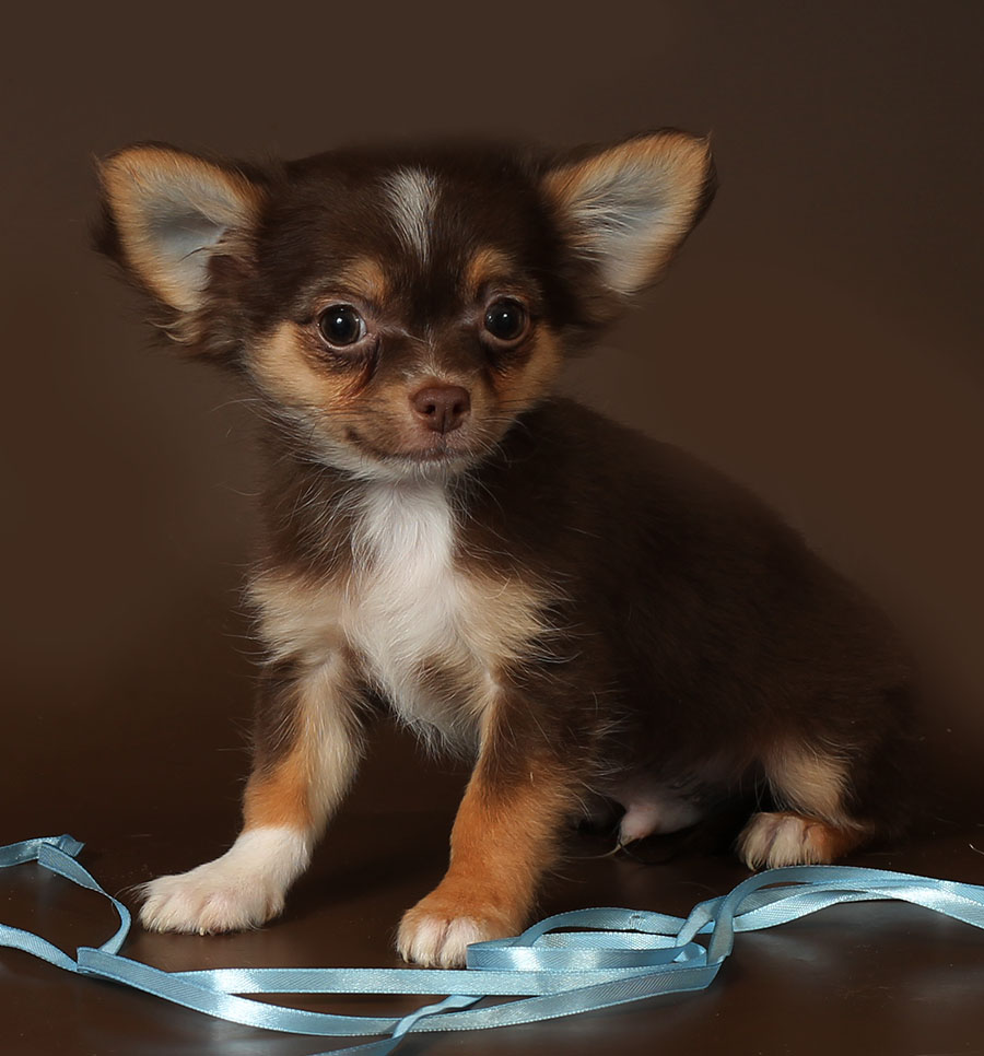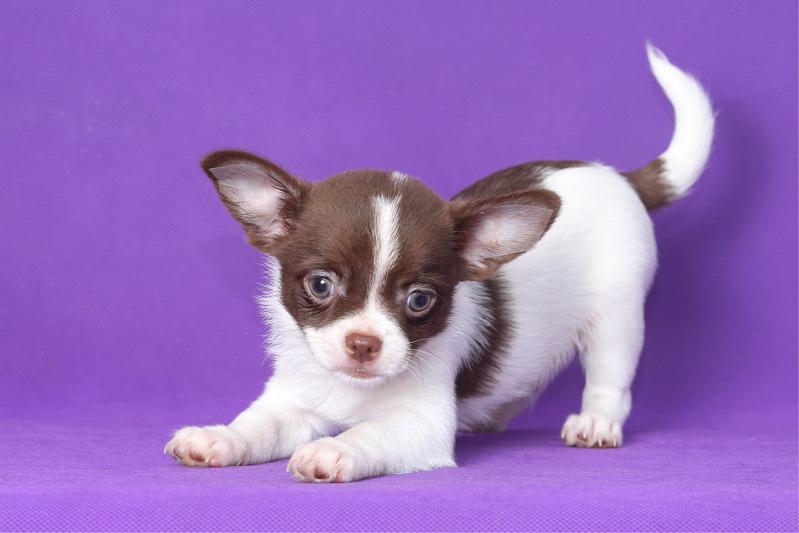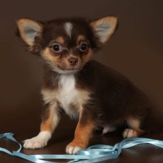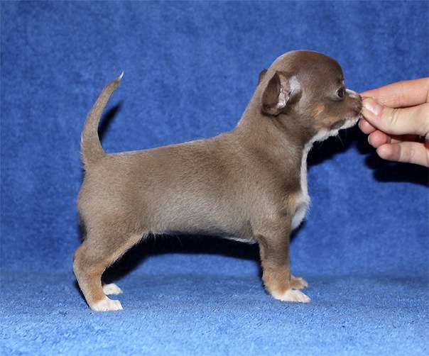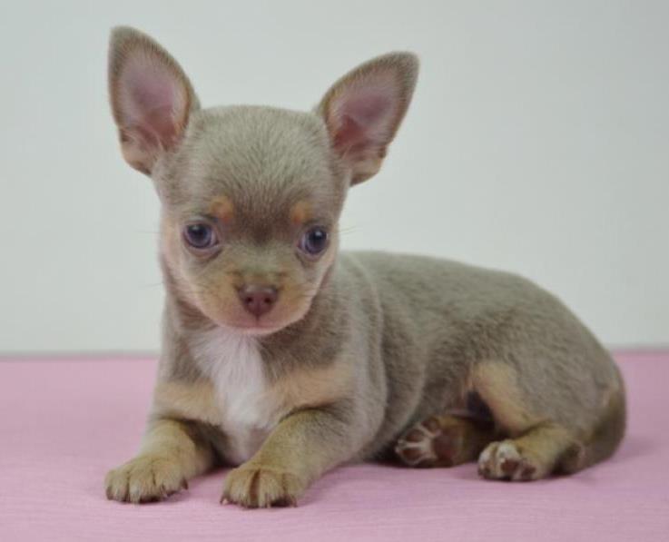 A very beautiful species of Chihuahua. Most effectively this color looks on pets with long hair. The saturation of the coat color can be from the lightest lilac to dark lilac. This color is most often supplemented with whitish spots on the chest and on the toes. But the presence of white spots on the back and sides of the body is excluded. Sometimes you can find lilac tricolor.