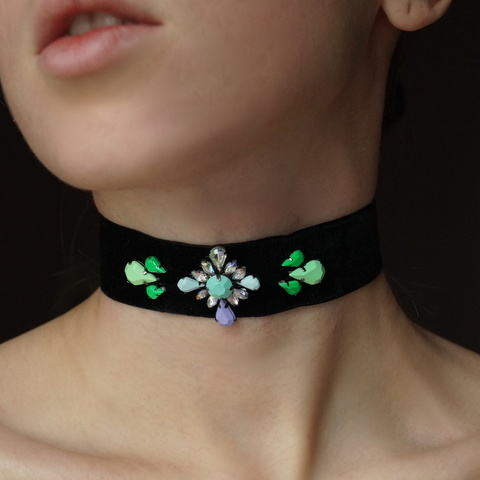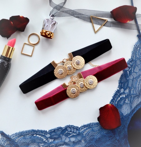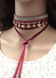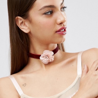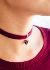 The color of the jewelry depends on the image, it can be in the same tone as the clothes or it is matched in contrast. The most popular shade is black. Such a necklace is universal. No less elegant looks product made in burgundy, emerald and chocolate color. Occasionally the outfits are decorated with powdery, smoky, white, red and blue chokers.