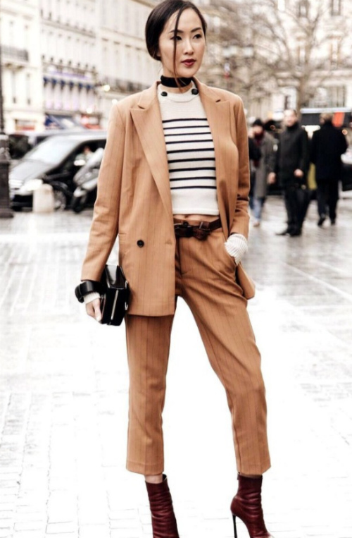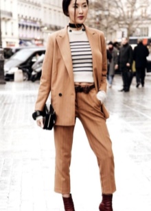 The ideal option for an accessory combination would be a spectacular evening dress with bare shoulders. Velvet stripes of different shades look advantageous with a dress of a laconic cut and a loose shirt with an open collar.